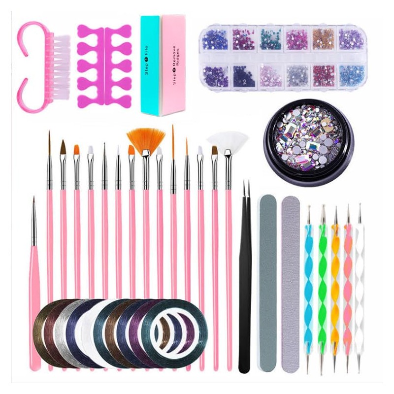 - Package Include: Nail art decoration tool includes 15 brushes, 5 dotting pens, 2 nail strips, 12 holographic nail art flakes sequins, 1 nail gems, 10 rolls striping tape and another tools and 4 sheet stickers