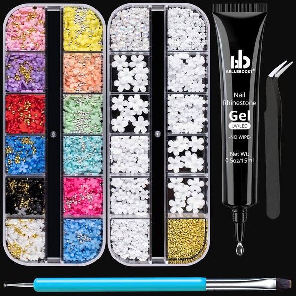 - 💎WHAT YOU WILL RECEIVE: This package contains 1 pc of 15ml tube design NO WIPE rhinestone gel glue; 2 boxes of 3D nail charm decorations including different colors and shapes of 3D flowers and tiny beads; 1 pc of dual-end dotting pen&brush and 1 pc of tweezer. This set helps you decorate your nails more conveniently.