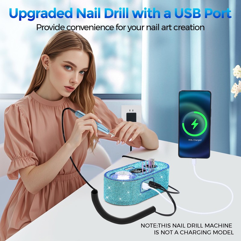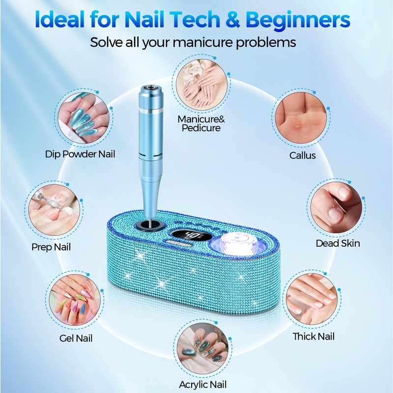 - Glitter Design Nail Drills: The sparkling AB Diamond e filer for nails is a bright and eye-catching tool. The crystal knob with soft lighting add a touch of elegance.This sleek, modern design not only enhances functionality but also provides a visually engaging experience, adding a touch of charm and luxury to your nail care (Note: The DEDNMSCA electric nail files are not rechargeable model)