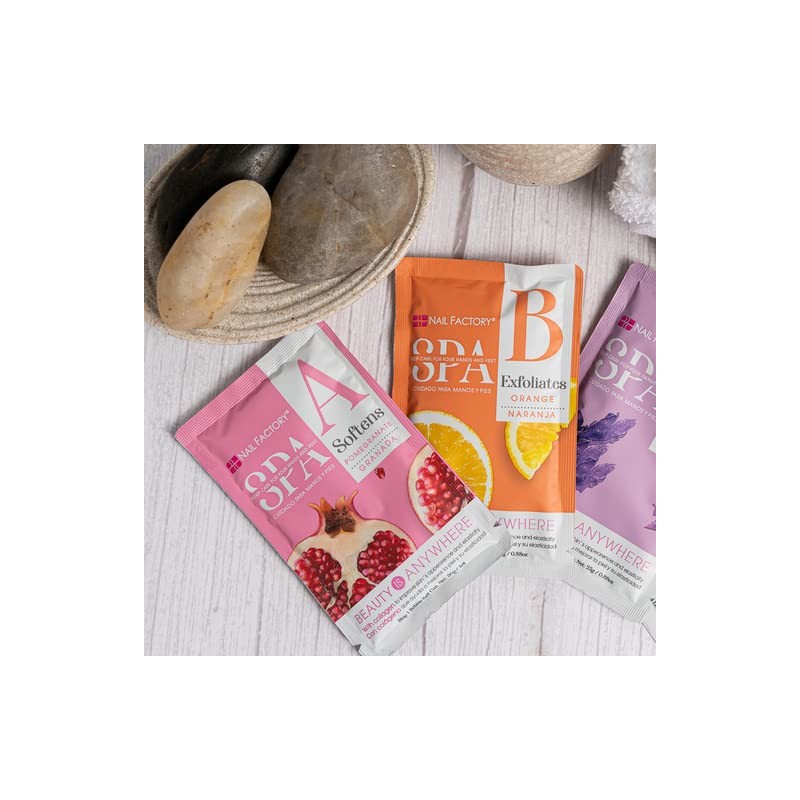 NAIL FACTORY - KIT SPA con Colageno para Manos y Pies con Sales, Exfoliantes, Mascarilla y Crema Humectante, 4 sobres individuales (MIX)