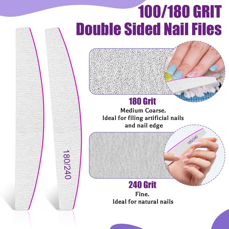 - Nail files grit 180/240: grit on two different sides. 180 nail file with medium coarse, 240 nail file with less coarse. This type of nail file is a gentle polishing of natural nails such as fingernails and toenails, which are suitable for home use.