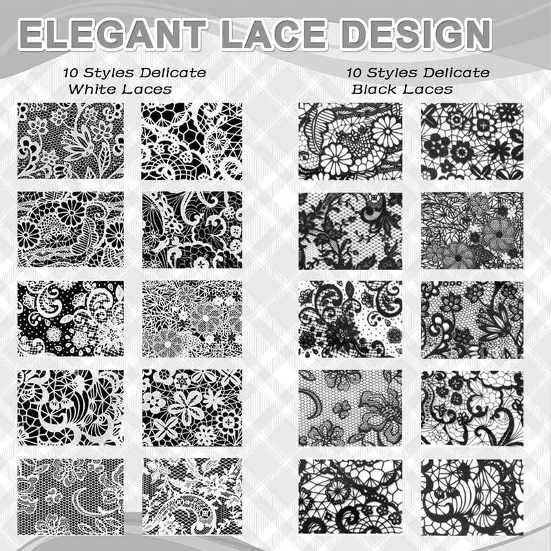 - 2. Elegant Lace Nail Design: Featuring stunning lace patterns, available in black and white colors, these foils allow you to easily create sophisticated, delicate lace nail designs. The starry sky foils are designed to last, offering a durable finish once sealed with a top coat. With proper use and care, the foils won’t crack or fade, providing long-lasting, eye-catching nail art results perfect for any occasion.