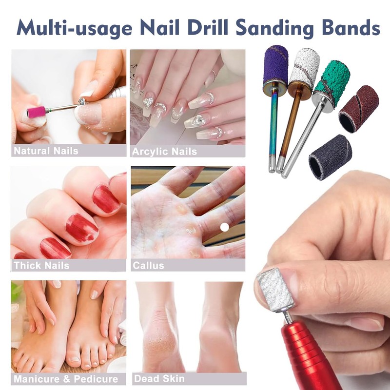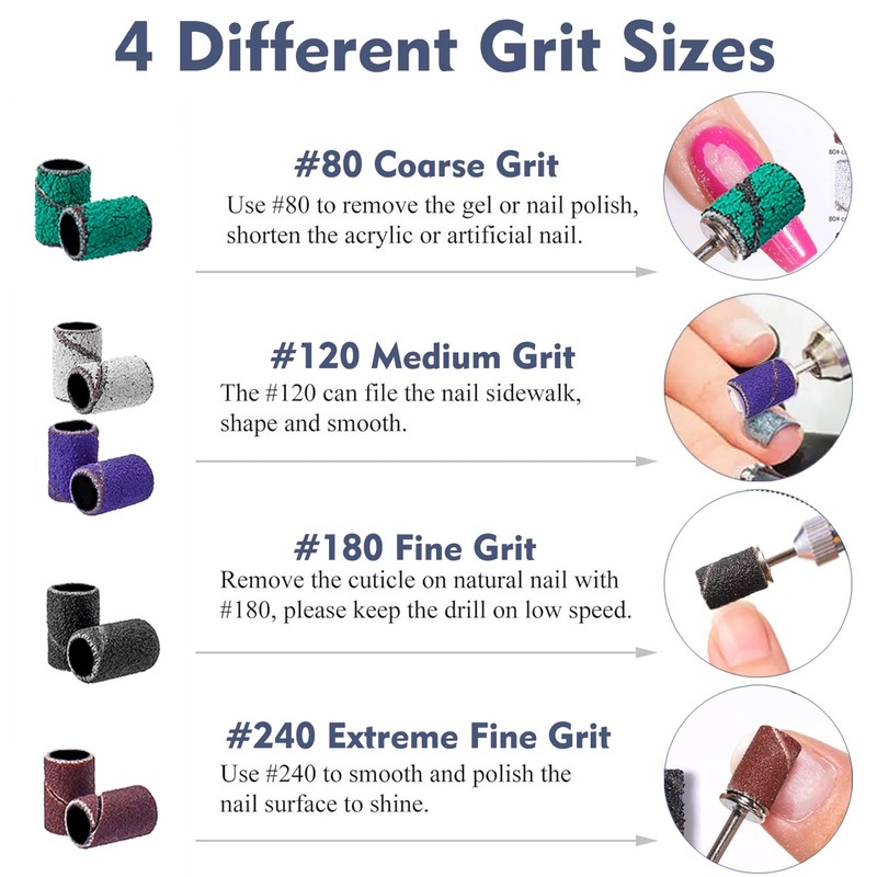 MULTI-USAGE NAIL DRILL SANDING BAND - 80&120grit are coarse and rough, suitable for shortening and shaping acrylic nails, thick gel nail or thick toenail. 180&240grit is suitable for sanding, smoothing and grinding.