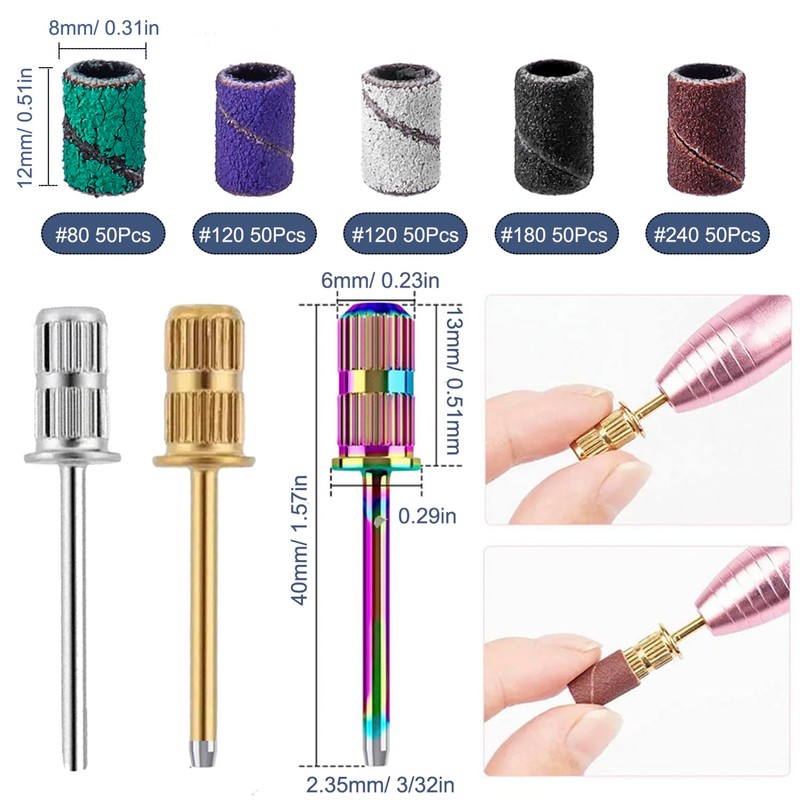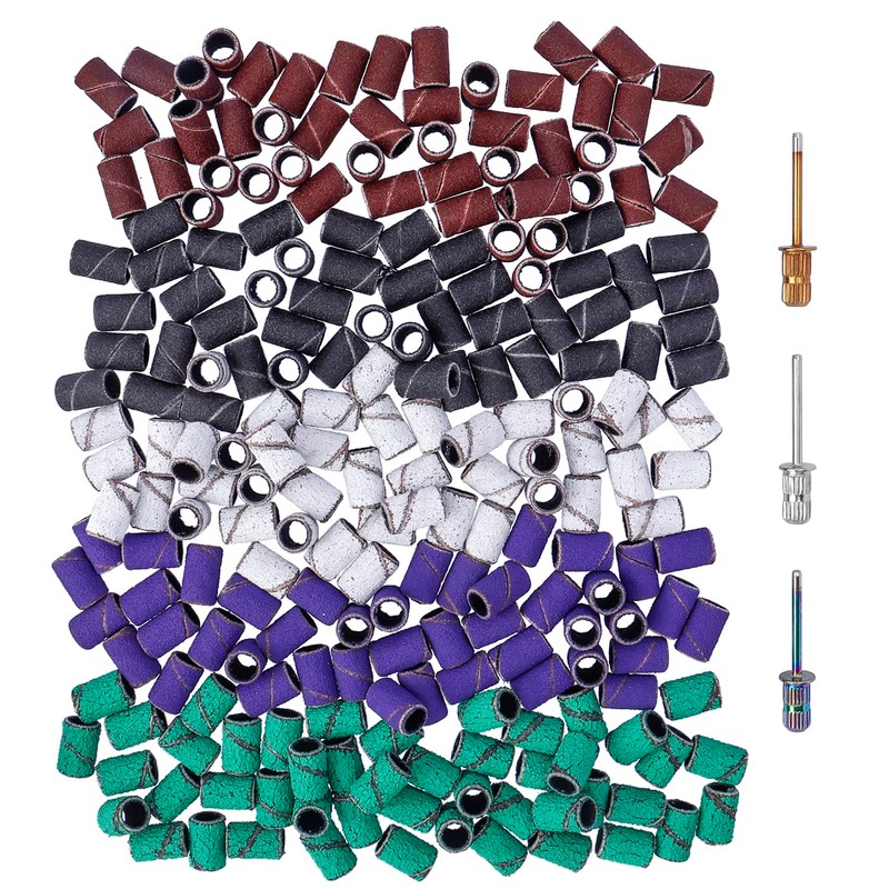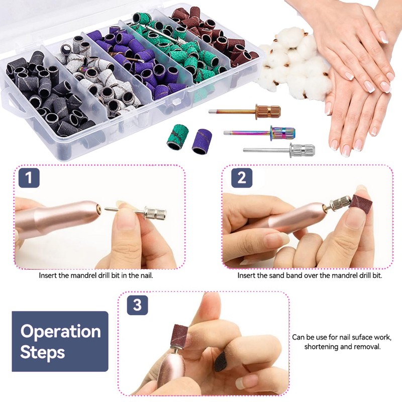 - Included 3Pcs 3/32 inch sanding bit for nail drill and 250pcs manicure sanding sleeves: 50 coarse grit 80#, 100 medium grit 120#, 50 fine grit 180 #, and 50 extreme fine girt 240#.