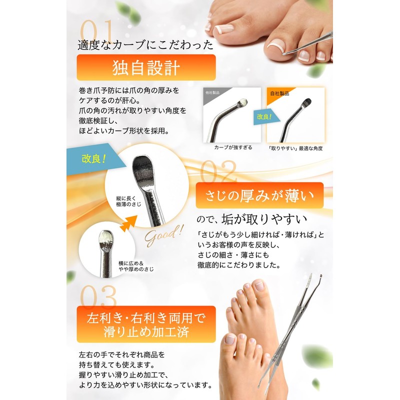(Supervised by Physical The) CREATOM Nail Scalp Remover is supervised by a physical the who has helped many customers solve foot problems. It is also recommended that you can remove many nail flakes, and the use of the dedicated file is very effective in preventing nails. [Pursuing an angle that can remove many nail scuff marks] There are many fingernails removal, but there are many things that are too strong to use, so when you try to use it, we have said that it will not enter deep between the nail and your finger, and it is difficult to apply force. CREATOM has worked on research, and its unique curve design creates an angle that easily slides into between the nail and finger. Changes the amount of fingerprint that can be removed by the width and thinness of a tablespoon: We have developed this product not only with the thickness of Creatom fingerprint and scissors. Thicker or wider will result in less fingerprint that can be removed. You can see the fingerprint accumulated, but it won't fall off. With such a lot of voices, CREATOM has undergone numerous tests to pursue the thickness and width that is easy to take, and we have worked hard to design it not too thick or too thin, not too wide or too narrow. Gently sharpen thick nails with special nail file: The small parts of the nail cannot be removed with just a tablespoon can be easily removed with the sharp point. In addition, since the file part can be used to sharpen the inside of the nails, it is very useful for adjusting the thickness of nails that cannot be removed by the file of nail clipping. You can also use it for nail care and sweetening. (Safe Support and Satisfaction Guarantee for Japanese Staff) Designed and sold by Japanese people with a 365 day long satisfaction guarantee. If you have any concerns, please contact us freely. Japanese staff will respond to sincerity.