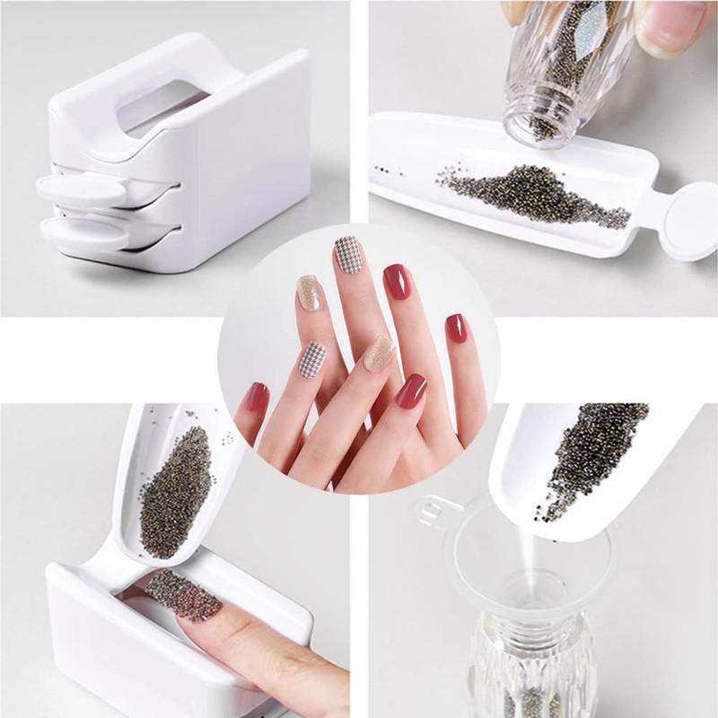 - Dip Powder Recycling Tray System The two-tray design dip powder receycling tray system helps you collect the nail art powder and reuse excess powder. The funnel helps you collect powder and save time .The pink nail brush is a plus, work well to brush the particles off.