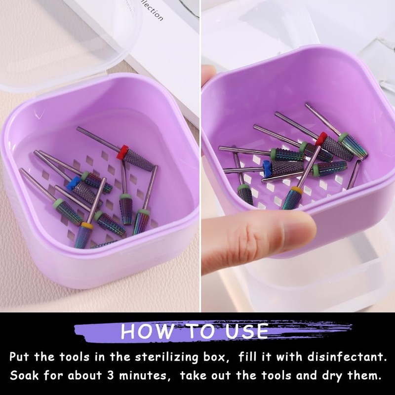 - 【You Will Get】 1pcs purple sterilizing box for nail art accessories tools in size of 3.15 x 3.15 x 2.75 inches. Please note only empty box, not included drill bits .