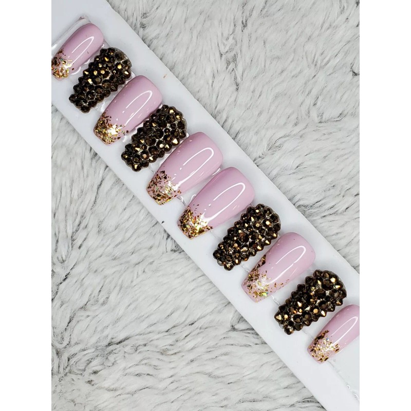 nailed by Rachel Baby pink gold bling short coffin press on nails diamond holographic holo