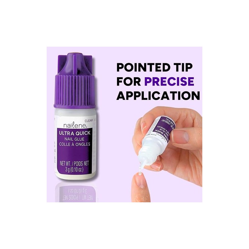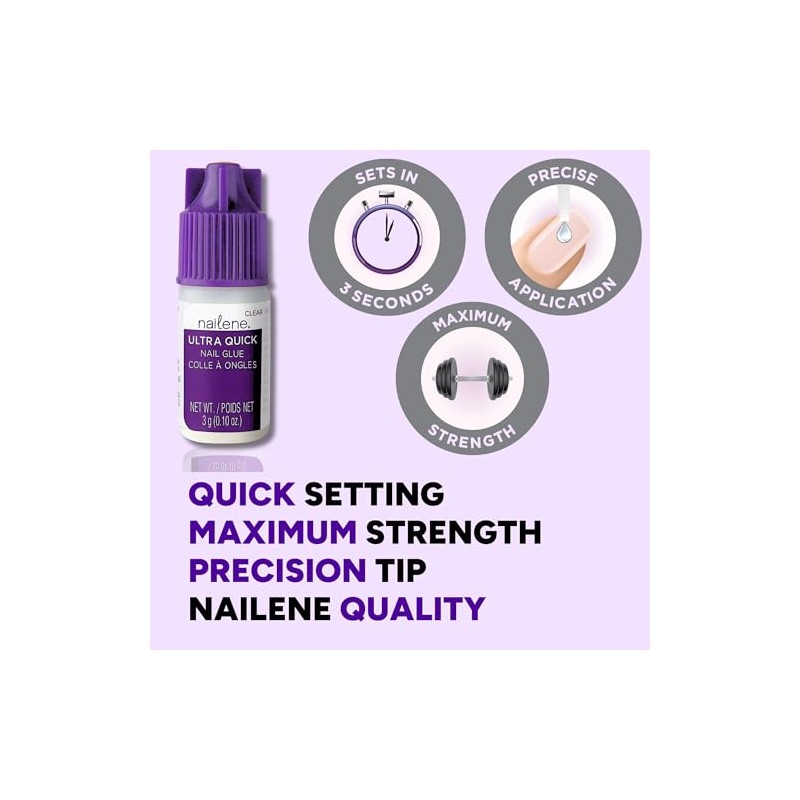 Nailene Ultra Quick Nail Glue is a high-quality option that bonds artificial and natural nails with superior holding power. It's quick drying nail adhesive that's ideal for artificial nail application as well as natural nail repair. It sets in seconds and holds firm for extra-long wear, making it a must-have for your nail kit or cosmetics bag. The precision tip applicator on this adhesive nail glue provides consistent dispersion to help you get the glue only where needed. Apply with care C this nail glue bonds in seconds. For artificial nails, spread a thin layer of this fake nail glue over nail, press and hold for 5 seconds. To repair a nail, place a drop on the break or tear, hold in place with tweezers for 5 seconds, then buff the area smooth. Nailene, the artificial nail experts for over 30 years, is your trusted instant manicure partner. Easy to apply and comfortable to wear, Nailene artificial nail lines cater to your needs for classic, simple, yet stylish nail looks for every occasion. Whether at home, school, or in the office, Nailene empowers you to feel confident and beautiful every day.
