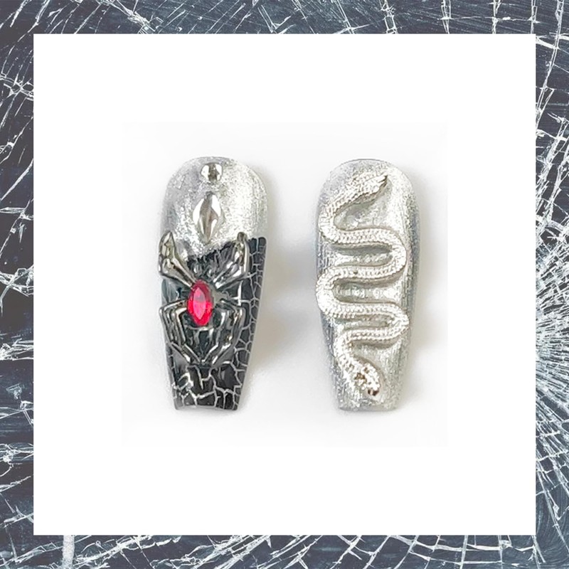 - Cool Fascinating Demon Flaw Style - Our captivating nail design features high-grade black shatter crackle polish and silver metallic polish as the main tones, detailed with black widow spider, cobra, bunny and chain for a idiosyncratic devil abyss look. These false nails are perfect for a variety of social occasions such as parties, clubs, weddings, proms, dates, Valentine's Day, Halloween, Christmas, and more. Elevate your nail game with our stunning and eye-catching designs!