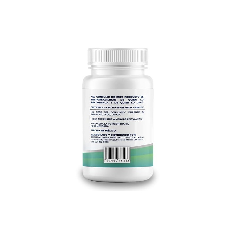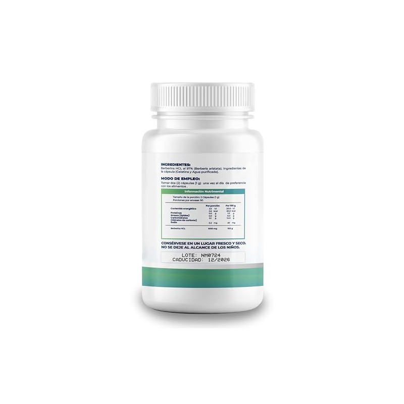 Acerca de este artículo Berberina HCL 97% Pura: Alta concentración de Berberina HCL al 97% para una absorción óptima y beneficios efectivos. Dosis Concentrada: Cada cápsula contiene 500 mg de Berberina HCL, ofreciendo una dosis ideal en una sola toma diaria. Apoyo Digestivo: Con propiedades antimicrobianas, este suplemento también promueve un funcionamiento digestivo óptimo. Ingredientes Naturales: Suplemento sin aditivos ni rellenos, asegurando un producto puro y de alta calidad. Presentación: Frasco de 100 cápsulas, Cont. Net. 50g c/u Modo de Empleo: Tomar 2 cápsulas una vez al día de preferencia con los alimentos.