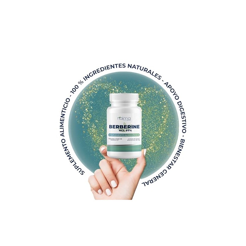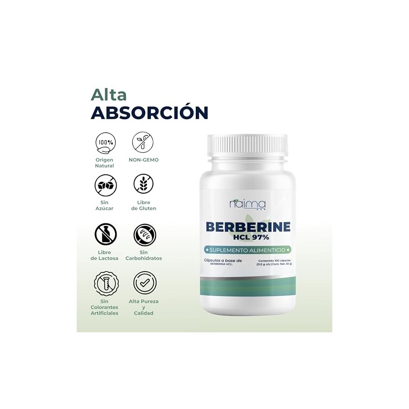 NAIMA Berberine HCL 97, 100 Cpsulas Suplemento Alimenticio 100 Puro y Natural Soporte Digestivo, Bienestar General Sin Aditivos ni Rellenos