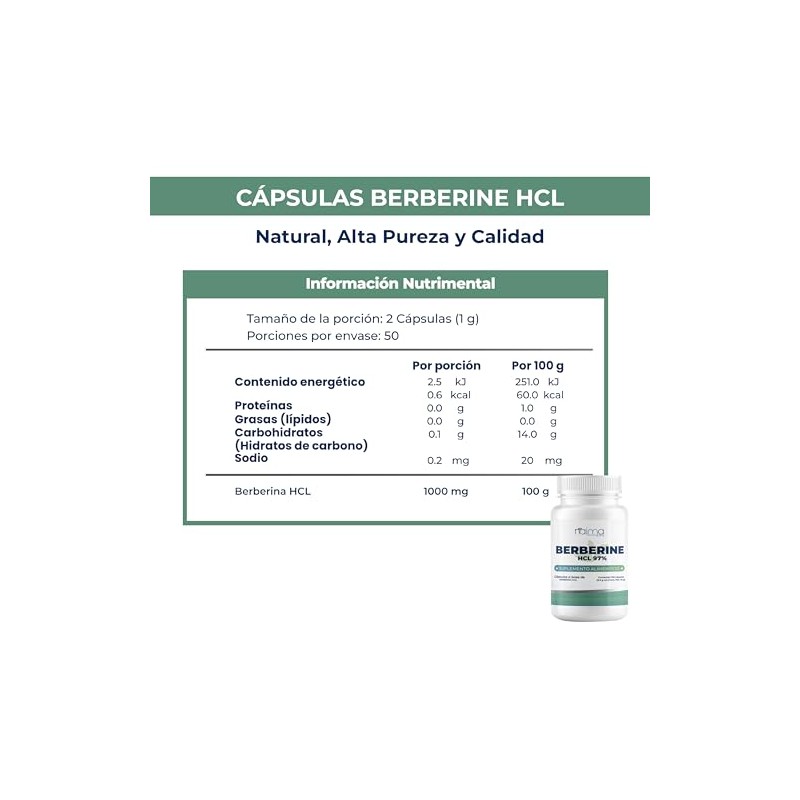 Acerca de este artículo Berberina HCL 97% Pura: Alta concentración de Berberina HCL al 97% para una absorción óptima y beneficios efectivos. Dosis Concentrada: Cada cápsula contiene 500 mg de Berberina HCL, ofreciendo una dosis ideal en una sola toma diaria. Apoyo Digestivo: Con propiedades antimicrobianas, este suplemento también promueve un funcionamiento digestivo óptimo. Ingredientes Naturales: Suplemento sin aditivos ni rellenos, asegurando un producto puro y de alta calidad. Presentación: Frasco de 100 cápsulas, Cont. 50g c/u Modo de Empleo: Tomar 2 cápsulas una vez al día de preferencia con los alimentos.