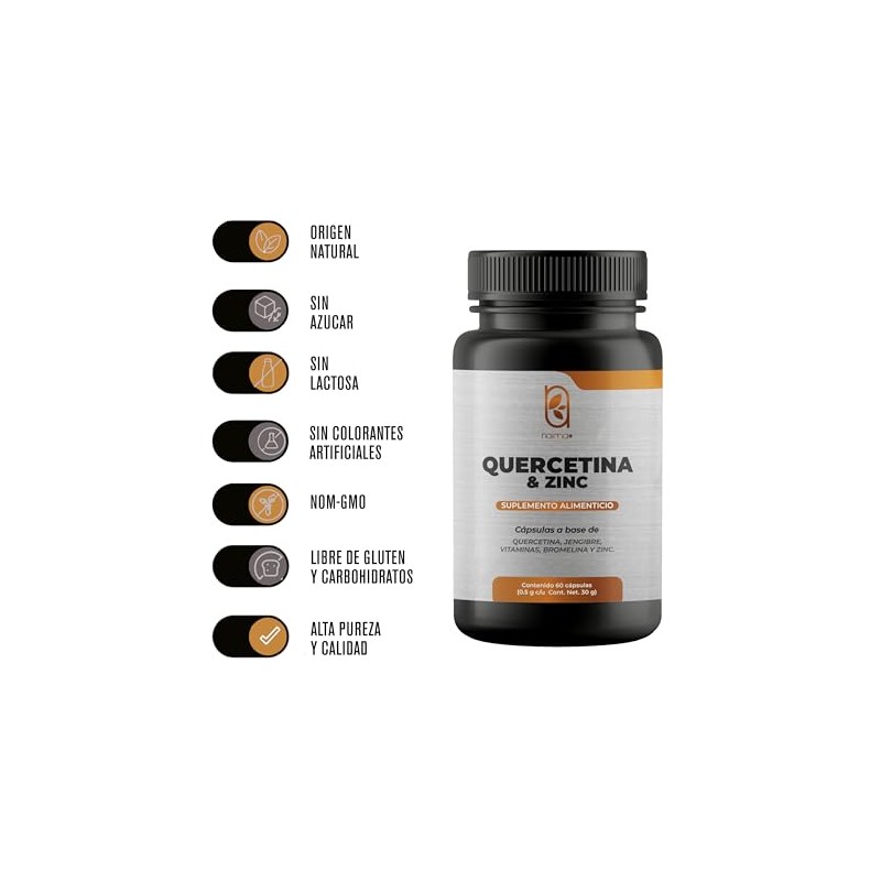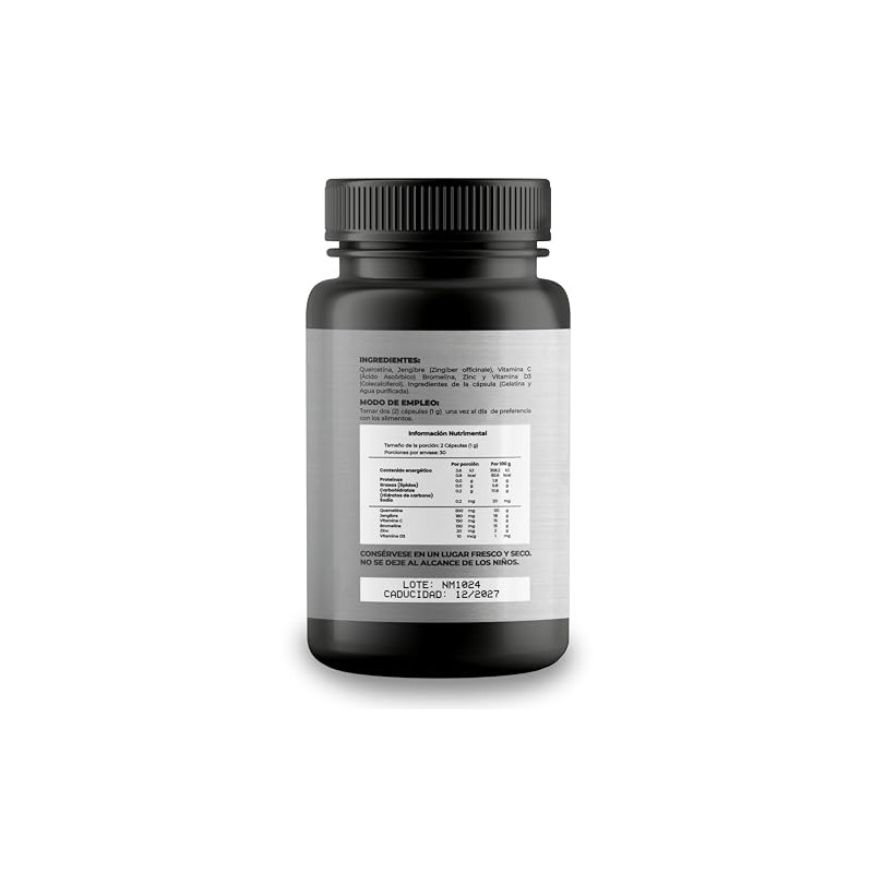Acerca de este artículo FORMULA AVANZADA: Mezcla de Quercetina, Zinc, Jengibre (Zingiber officinale), Vitamina C (Ácido Ascórbico) Bromelina y Vitamina D3 Cada capsula contiene 500mg 100% NATURAL: Nuestras cápsulas no contienen ingredientes artificiales o de relleno para maximizar los beneficios MODO DE USO: 2 Cápsulas al dia con los alimentos CONSÉRVESE EN UN LUGAR FRESCO Y SECO. NO SE DEJE AL ALCANCE DE LOS NIÑOS.