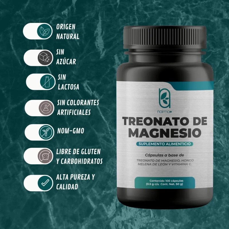 NAIMA Treonato de Magnesio, 100 Cápsulas | Con Hongo Melena de León y Vitamina C | Suplemento Alimenticio 100% Puro y Natural| Concentración, Mente Activa, Rendimiento Mental | Sin Aditivos