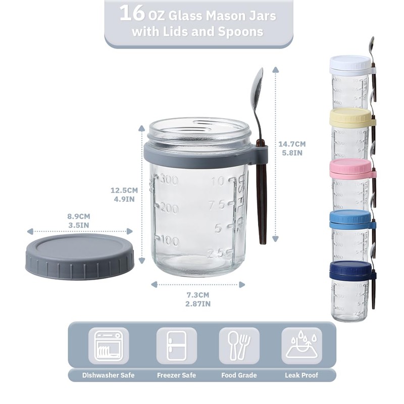 Naivees 6 Pack 16oz Oats Containers with Lids and Spoon Glass Mason Jars for Overnight Oats Empty Airtight Jars for Fruit,Milk,Salad and Yogurt (Multicolour)