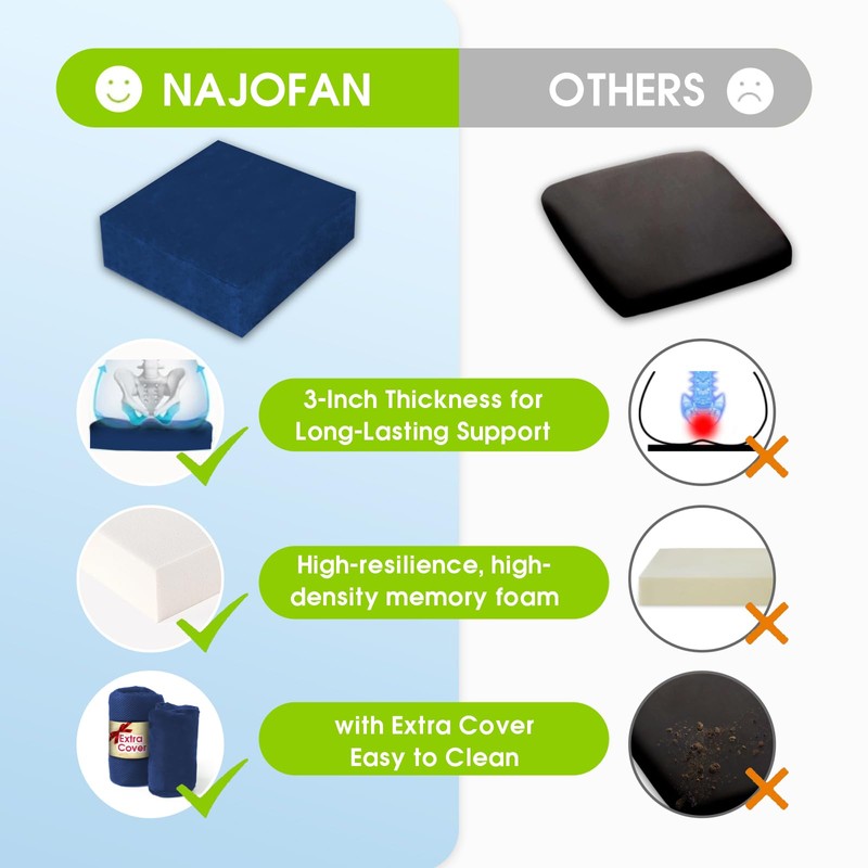- [Comfort for all-day sitting] The NAJOFAN wheelchair cushion is 18x16x3 inches,suitable for most seat sizes. Provides instant comfort on any hard surface: office chair, desk chair, kitchen, rocking chairs and wheelchairs. The additional height to make it easier for you to rise and sit down from your chairs, making it a great choice for upgrading seat comfort