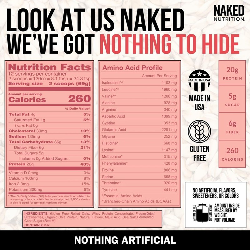 - THE NAKED DIFFERENCE: Gluten Free Rolled Oats, Whey Protein, Freeze Dried Strawberries, Organic Chia Protein, Natural Flavors, Malic Acid, Sea Salt, and Fermented Cane Sugar.