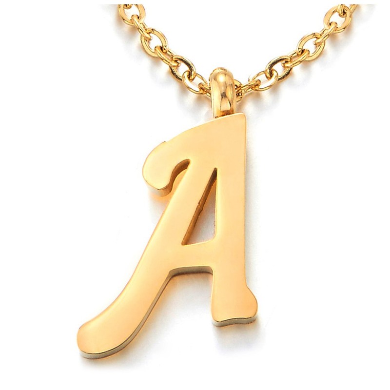 Name, initial alphabet, letters A-Z, pendant stainless steel necklace for men and women, colour gold, with 50 cm steel rope chain, Stainless Steel