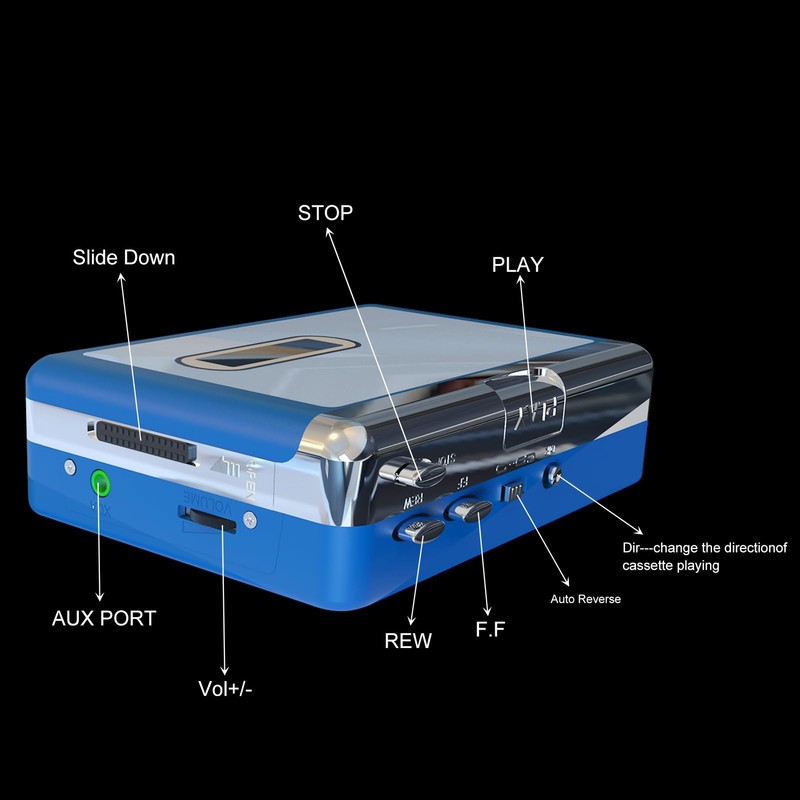 Control Buttons: PLAY, STOP, F.F, REW, DIR. Auto reverse switch, Volume control.