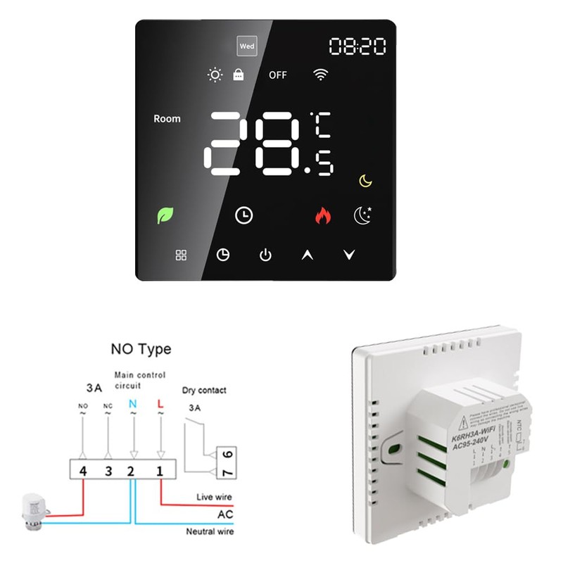 LCD Touchscreen Display: The intelligent thermostat is equipped with an LCD color screen and an NTC sensor, which offer precise and transparent temperature readings, enabling effortless monitoring of your surroundings.