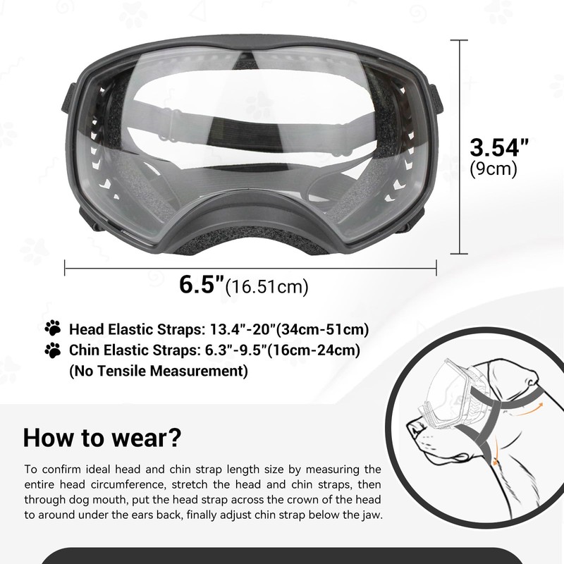 - Adjusted head and chin straps for better stability, Head Elastic Straps: 13.4"-20"; Chin Elastic Straps: 6.3"-9.5". Need to adjusted fit to avoid glasses slipping off and hurting dog eyes.