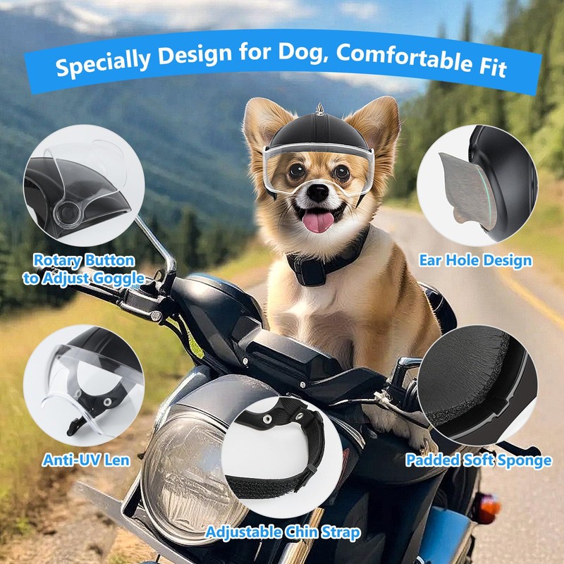 - Integrated: This doggie helmets have a anti-uv visor to protect dog eyes and head, customers don't need to purchase dog helmet and glasses separately. Dog helmet with glasses included are UV Protection, Windproof, Snowproof. Protect dog eyes from dust, debris and dirt.