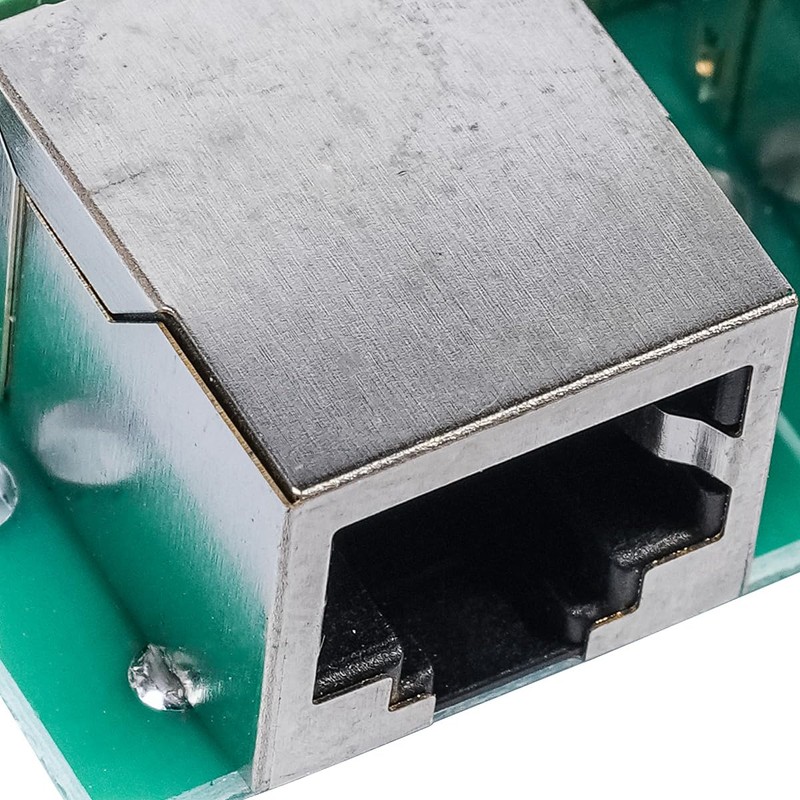 • Both the 8-pin solderless spring crimp connector and RJ45 female are soldered to a PCB plate, a compact plate that is more suitable for tight spaces.