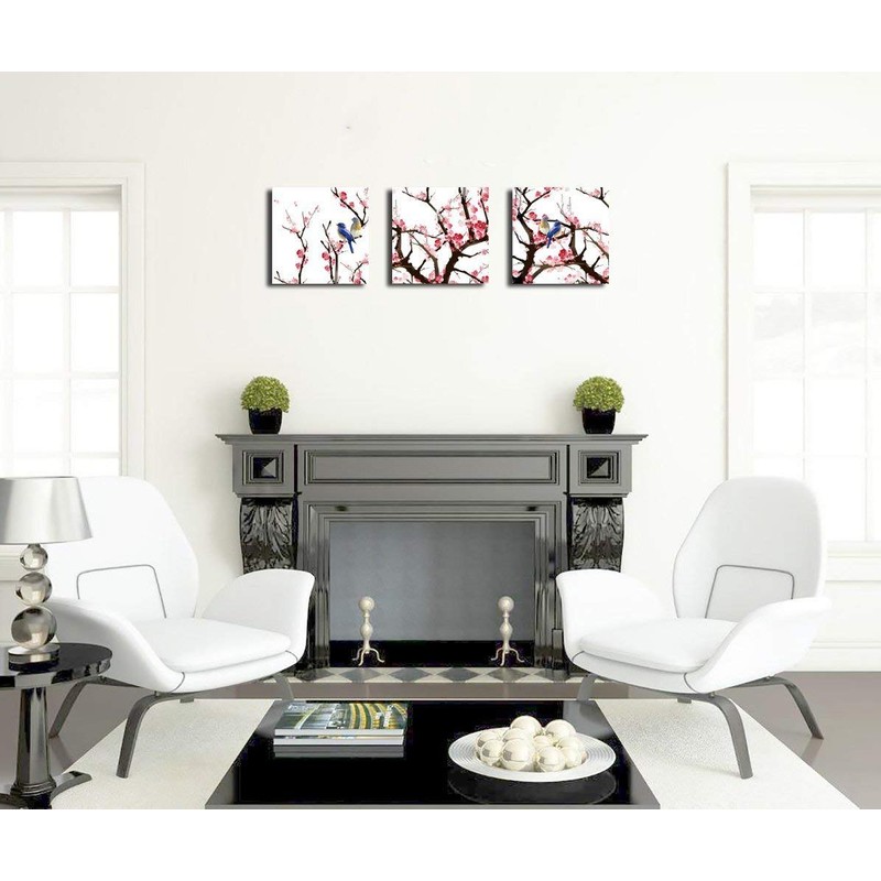 NAN Wind Small Size Traditional Chinese Painting of Birds on Peach Trees Canvas Prints 3 Panels Wood Framed Peach Blossom Wall Art Plum Flowers Print Painting 12x12inches 3pcs/set