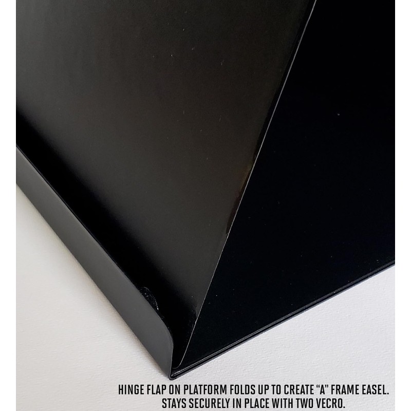 - The easel platform folds onto the inside back cover when closed. To form the easel just flip the binder inside out and the hinge on the 3rd panel platform will catch the edge of the inside front cover and Velcro together to form a secure A frame easel