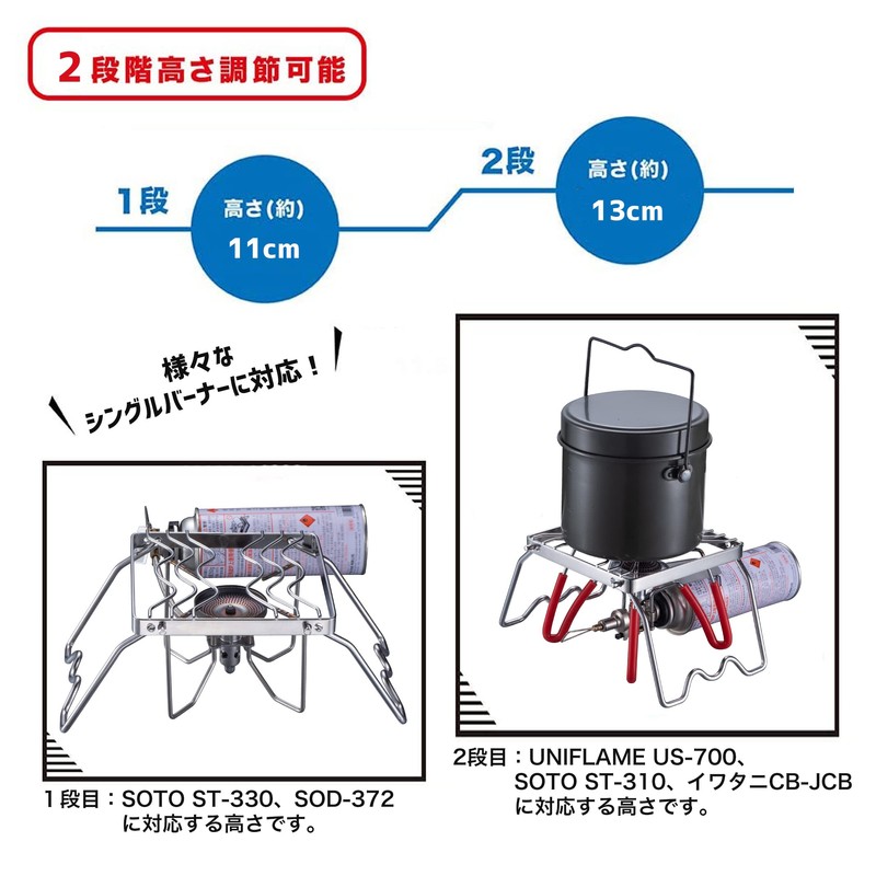 - The grill stand is convenient for outdoor cooking. It can be used as a stand for Dutch ovens, as a trivet for a single burner, rice kettle boning, frying pan, and bonfire stand. You can even bake food by placing a net on the trivet. Customers especially appreciate the SOTO ST-310 compatibility with the "SOTO ST-310". Of course, it is also compatible with other single burners. When stored, it can be folded for compact storage and easy carrying. Specifications have been changed to prevent bending due to inflation heat. Bend the trivet rod into "S" shape to prevent curving. Long lasting stable and safe to use