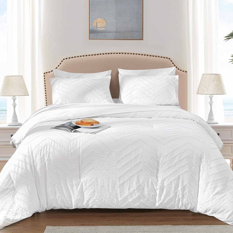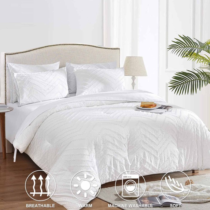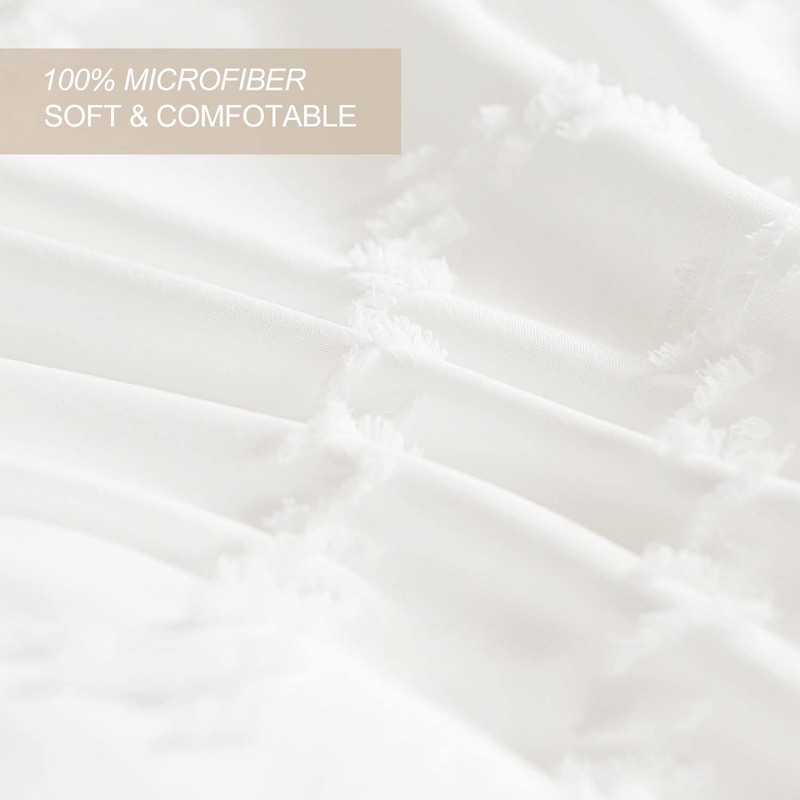 - The 7 piece white tufted jacquard boho king comforter set includes 1 duvet insert or stand-along comforter (104 x 90 inches), 4 matching pillow shams (20 x 36 inches), 1 flat sheet (108 x 102 inches), 1 fitted sheet (78 x 80 inches).