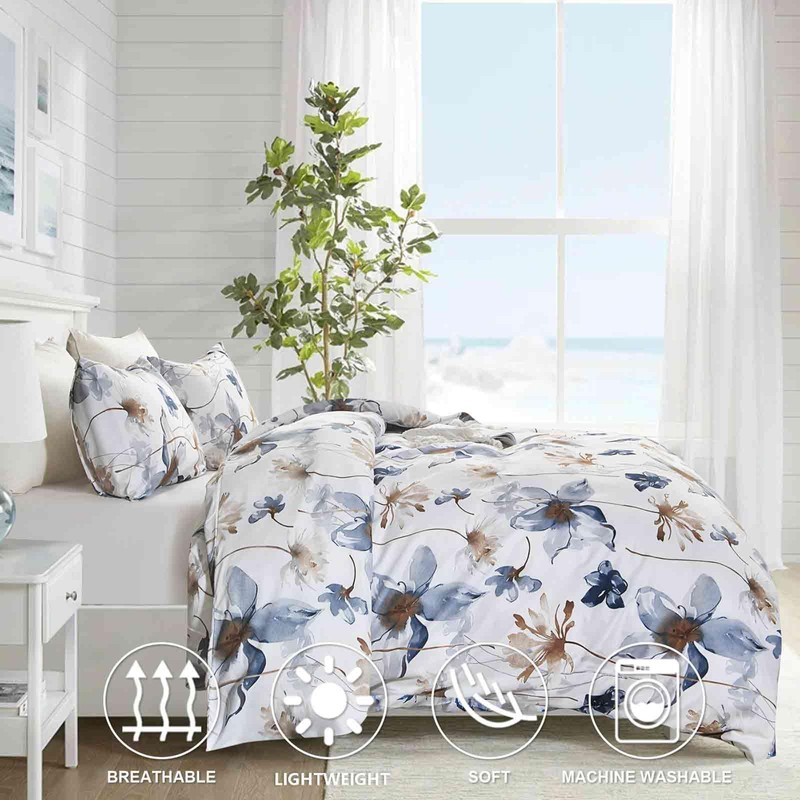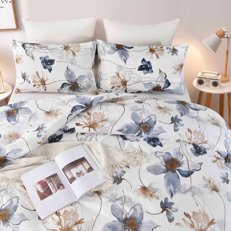 - SUPERB MATERIAL-Slip into comfort and luxury! This blue beige floral / flower pattern duvet cover set is made from premium brushed Microfiber. It gives you the ultimate soft feel at a great value and keeps you comfortable all through the night. Our duvet cover is luxurious, stylish, and the softest duvet cover you'll ever own. Queen Size: 1 duvet cover ( 90x90 inches), 2 pillow cases ( 20x26 inches).Without comforter.