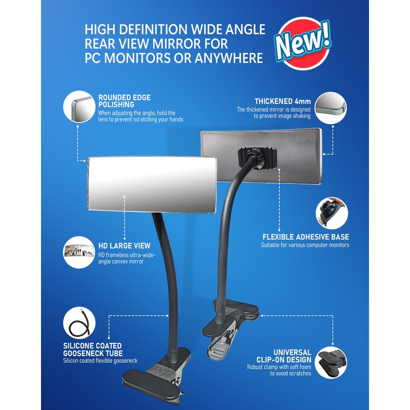 - TOOL-FREE CLIP-ON INSTALLATION - NO ADHESIVES NEEDED - The clip-on design attaches securely to any surface up to 2" thick, no drilling, tapes, or permanent fixtures required. Easily move it between your desk edge, computer monitor, cabinet, or cubicle wall, offering unmatched versatility compared to sticky mirrors that damage surfaces or can’t be repositioned.