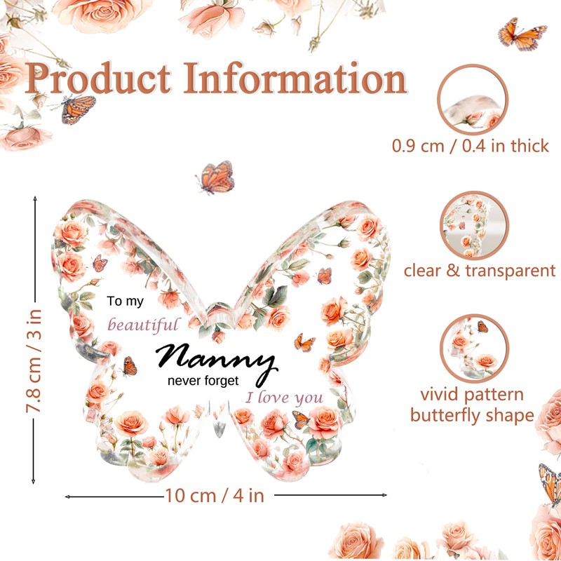 - 【Profound Love Expression】This butterfly-shaped acrylic plaque, with its unique design and the warm words "to my beautiful nanny, never forget I love you", profoundly expresses your love for your loved nanny. The embellishment of pink flowers makes this love more romantic. It is one of the best nanny gifts.