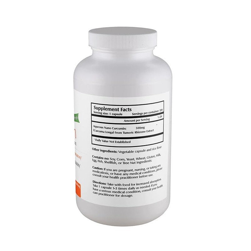 - SAFE TO USE: Curcumin nano supplements are made from curcumin extract from Turmeric root with no soy, yeast, gluten, corn, wheat, milk, egg, fish, shellfish, or tree nuts. You get 500mg of nano particle curcumin per serving capsule and nothing else.