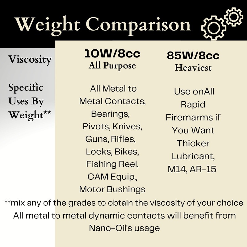 - LIGHT: 10 WEIGHT NANO OIL 10 - Armament & Industrial NanoLube- Suitable for all Guns, Rifles, Flashlight Threads (anti galling), Knives, Fishing Reels, Swiss Army Knives, Locks, Hinges, Bicycles: Bearings, Cables, Chains, Sprockets and Derailleur, Motorcycle forks (will also reduce pitting of chromes), electric motors bushings, commutator/brushes assemblies, Cam driven Equipments, Model RailRoad