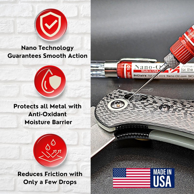 - PREVENT & ELMINATE RUST WITH A FEW DROPS: Offered in a precision lubricant needle oiler tube for convenient use, effortlessly measure out the amount of knife lube you need with minimal waste and apply it precisely for spot treatment. Will render the opening & closing extemely smooth after 5 drops two on each side of the blade/washers front & back + one on the locking mechanism.