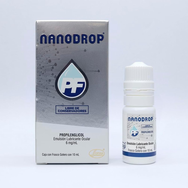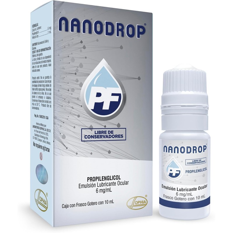 - Nanodrop PF es una nanoemulsión que ofrece hidratación y protección extendidas a todas las capas de la película lagrimal. Contiene elementos estructurales presentes en la lagrima natural que ayudan a hidratar y restablecer la película lagrimal de forma rapida y por más tiempo.