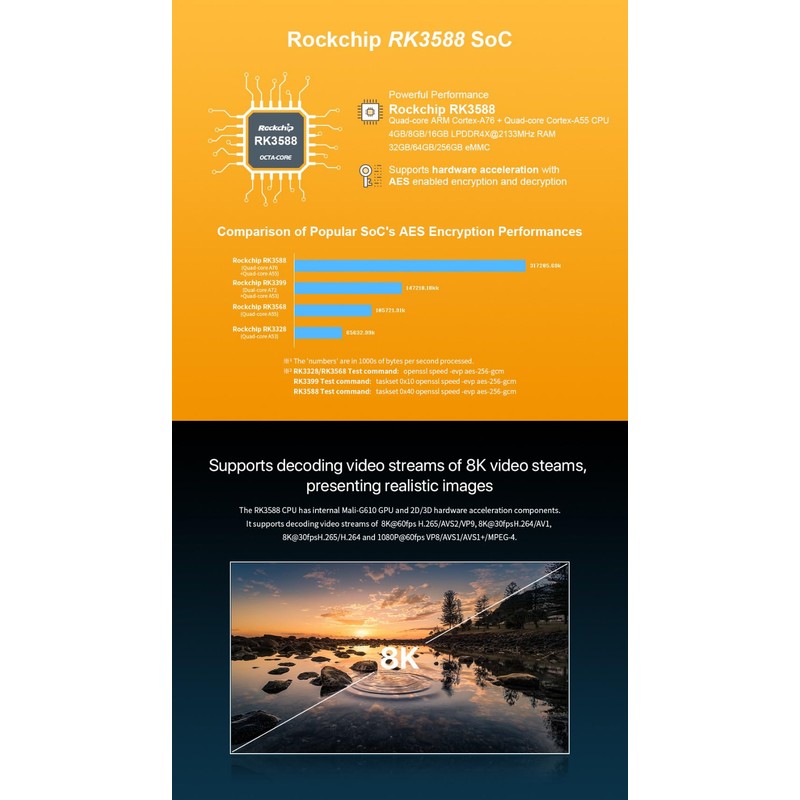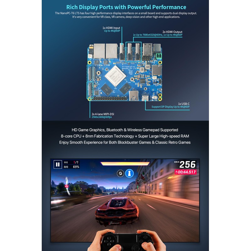 - [8K Video Decoders and Encoders] NanoPC-T6 computer wifi router has two HDMI output interfaces and one HDMI IN interface, it can decode and play video streams up to 8K60p H.265/VP9, 8K30p H264 and other formats of video, and can record video streams 4k60p H.265 format video. Able to obtain high-frequency game graphics and the fun of best-selling games.