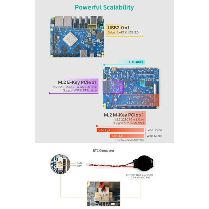 - [Rich Hardware Resources] NanoPC-T6 LTS mini wifi router has 2x HDMI output ports and 1x HDMI IN port. T6 has one M.2 B-Key slot that supports an M.2 NVME SSD disk, one M.2 E-Key that supports M.2 2230 WiFi module. It has one USB 3.0 and two USB 2.0 ports, and one full-featured USB-C port that is powered by DC-12V. And it can also supports booting with TF cards and using 4G LTE USB module.