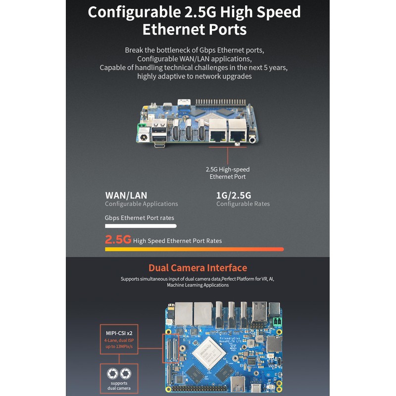 - [Office Home Smart IoT Gateway] The NanoPC-T6 LTS is an open-sourced mini smart IoT gateway device with two 2.5G Ethernet ports. It is integrated with Rockchip RK3588 high performance CPU, 64-bit 4/8/16GB LPDDR4x RAM at 2133MHz, and 32/64GB eMMC flash, Mali-G610 MP4 GPU, 6TOPs NPU. NanoPC-T6 LTS computer wifi router also supports GPU and VPU acceleration.