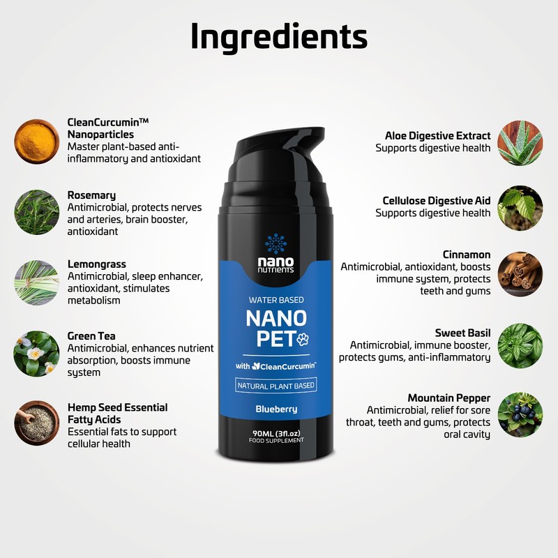 - Support your pet with nourishing nanoparticles! With a delicious apple & blueberry flavor, this highly bioavailable Curcumin supplement contains CleanCurcumin(TM) nanoparticles and 9 other beneficial botanicals that deeply nourishes and penetrates problem areas for superior relief and protection for your pet. This product is 100% synthetic-chemical-free.