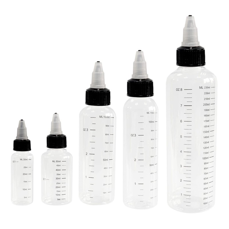 - Pack10 pieces clear plastic multipurpose bottle with black tips and twist-on cone lids