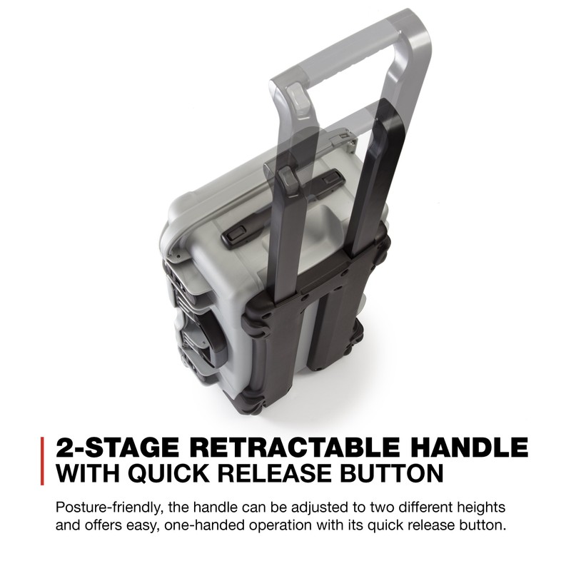 • Polyurethane wheels: Withstand rough terrain, paired with a one-handed retractable handle for easy use