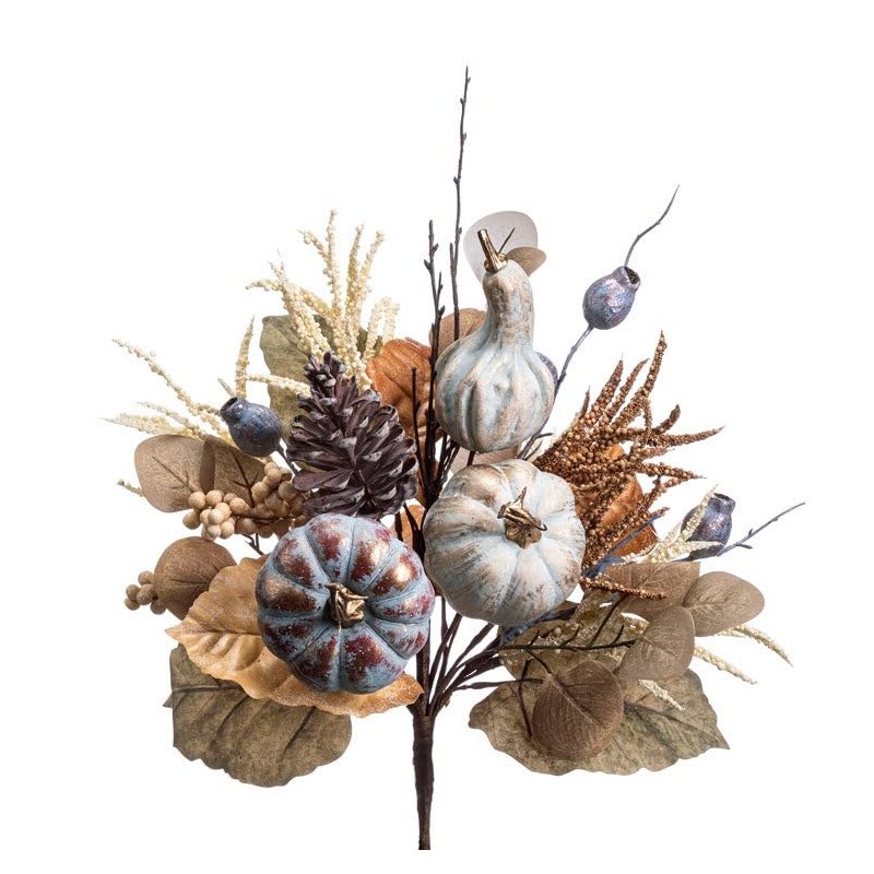 • Add a touch of elegance to your harvest décor with this foliage pick adorned with berries and bronze brushed pumpkins and gourds
