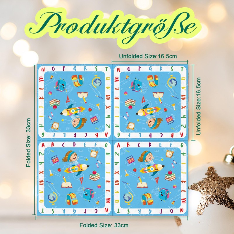 - 【Vibrant back to school napkins】Make your back to school celebration even more special with our uniquely designed napkins. Featuring a vibrant blue background, decorated with colorful illustrations of school bags, pens, globes and books, these napkins are perfect for creating a cheerful and educational atmosphere for your party. Each design element is carefully designed to awaken excitement and joy for the new school year.