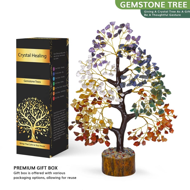 - Crystals And Healing Stones - The crystal tree branches are beaded with seven chakra stones such as red jasper, amethyst, lapis lazuli, carnelian, clear quartz, yellow aventurine, and green aventurine crystals. This is a unique spiritual stuff.