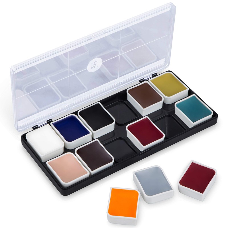The Zombie Alcohol Activated Palette contains an excellent mix of colors to create a variety of zombie effects. From traditional to bloody, dirty, and bruised zombie effects, the palette contains 12 highly pigmented, water, sweat and transfer proof colors that dry instantly after application.