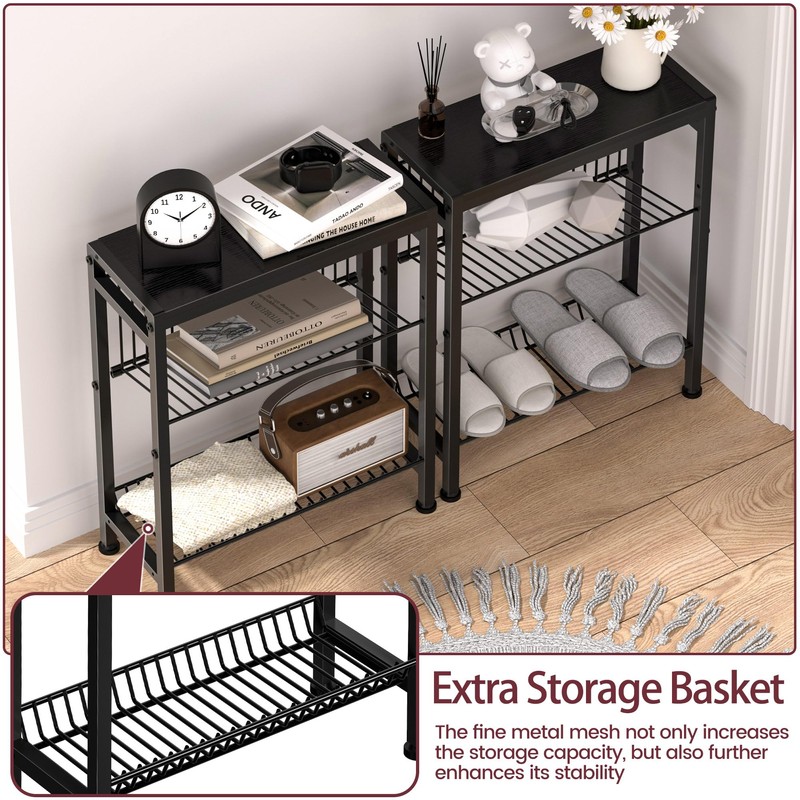 - [Space Saving Designs] Product Size: 7.1"D x 17"W x 22.2"H. Great Designs for Tight Spaces, especially for use as a sofa side table or slim nightstand. This narrow side table takes up a small amount of space, but still has plenty of room for storage. You can put your cell phone, coffee mugs on the top shelves, and books like magazines in the L or V shaped basket in the center,put snacks or toys in the wire shelf in the bottom